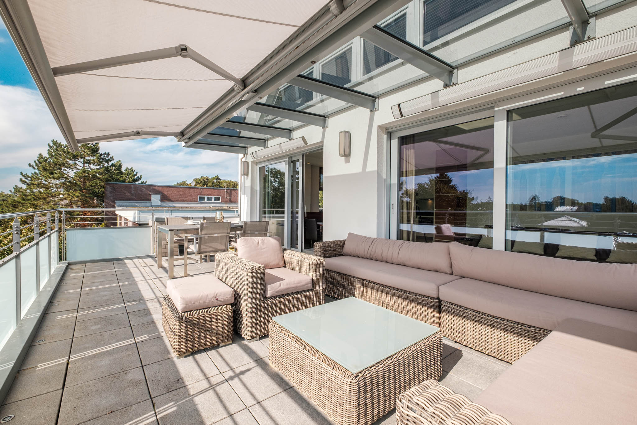 Die 28qm große Dachterrasse mit Markise in Süd-Westlage rundet dieses fantastische Urlaubsdomizil ab.